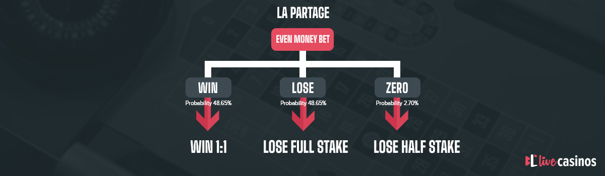 The La Partage rule in roulette means that even money bets pay half of their stake back if the ball lands on 0.
